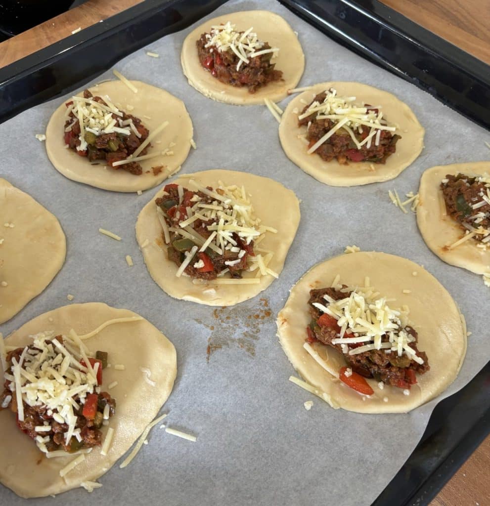 - Saupoudrez un peu de fromage râpé sur le dessus de chaque empanada.