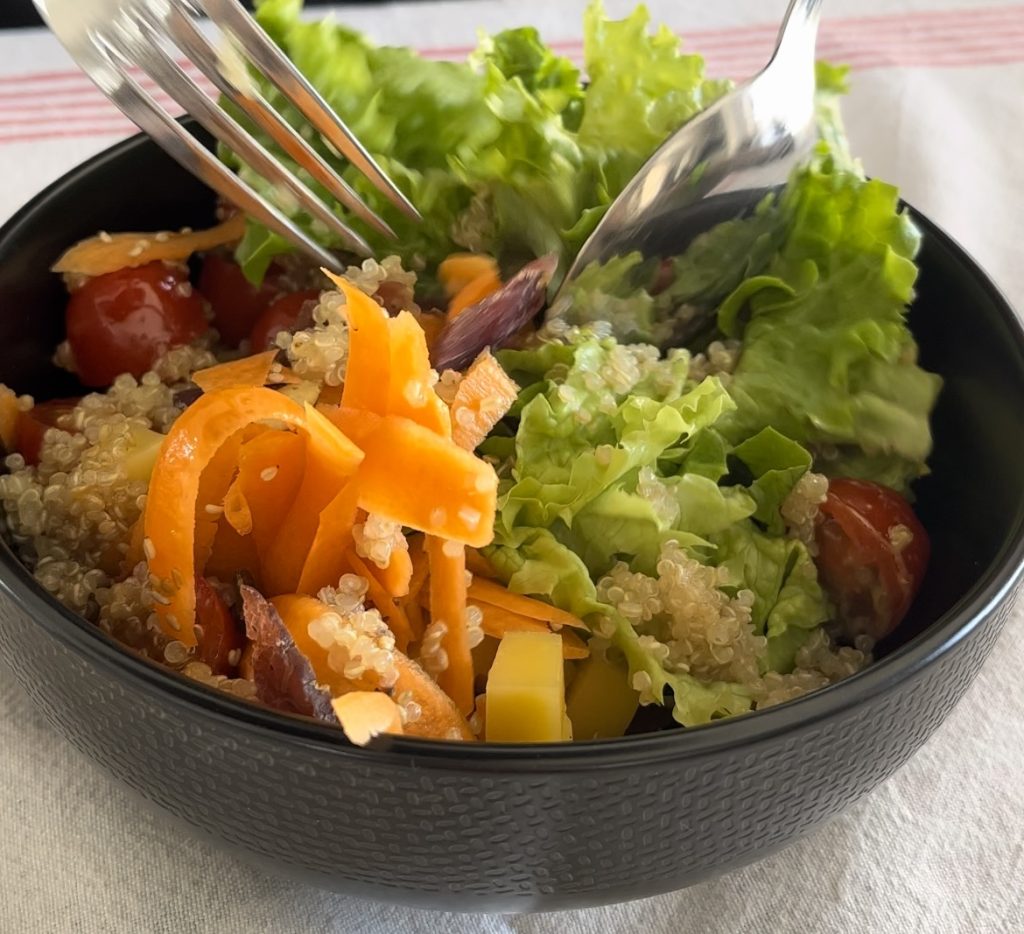- Laissez refroidir le quinoa une fois cuit et mélangez tous les composants dans le saladier.